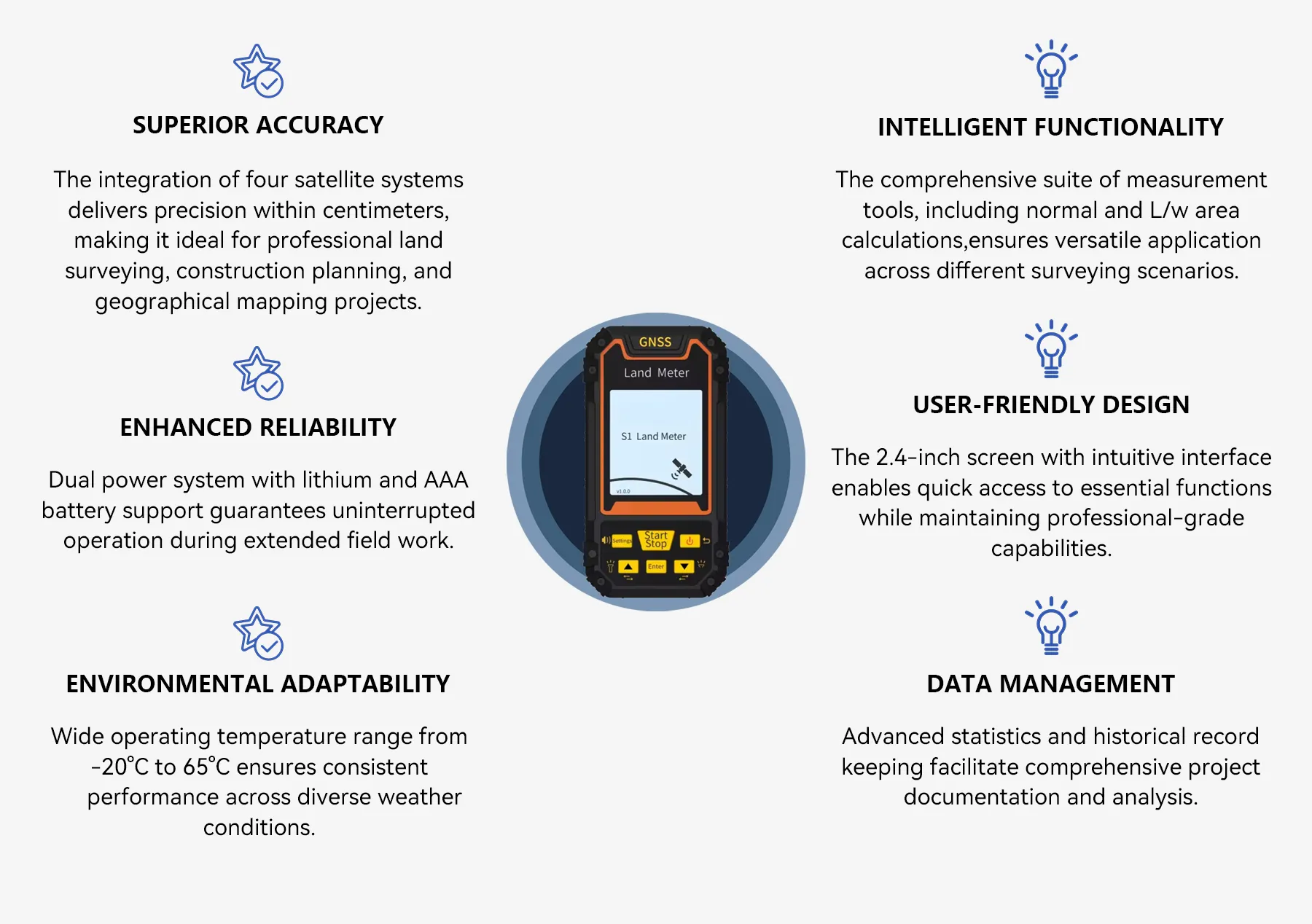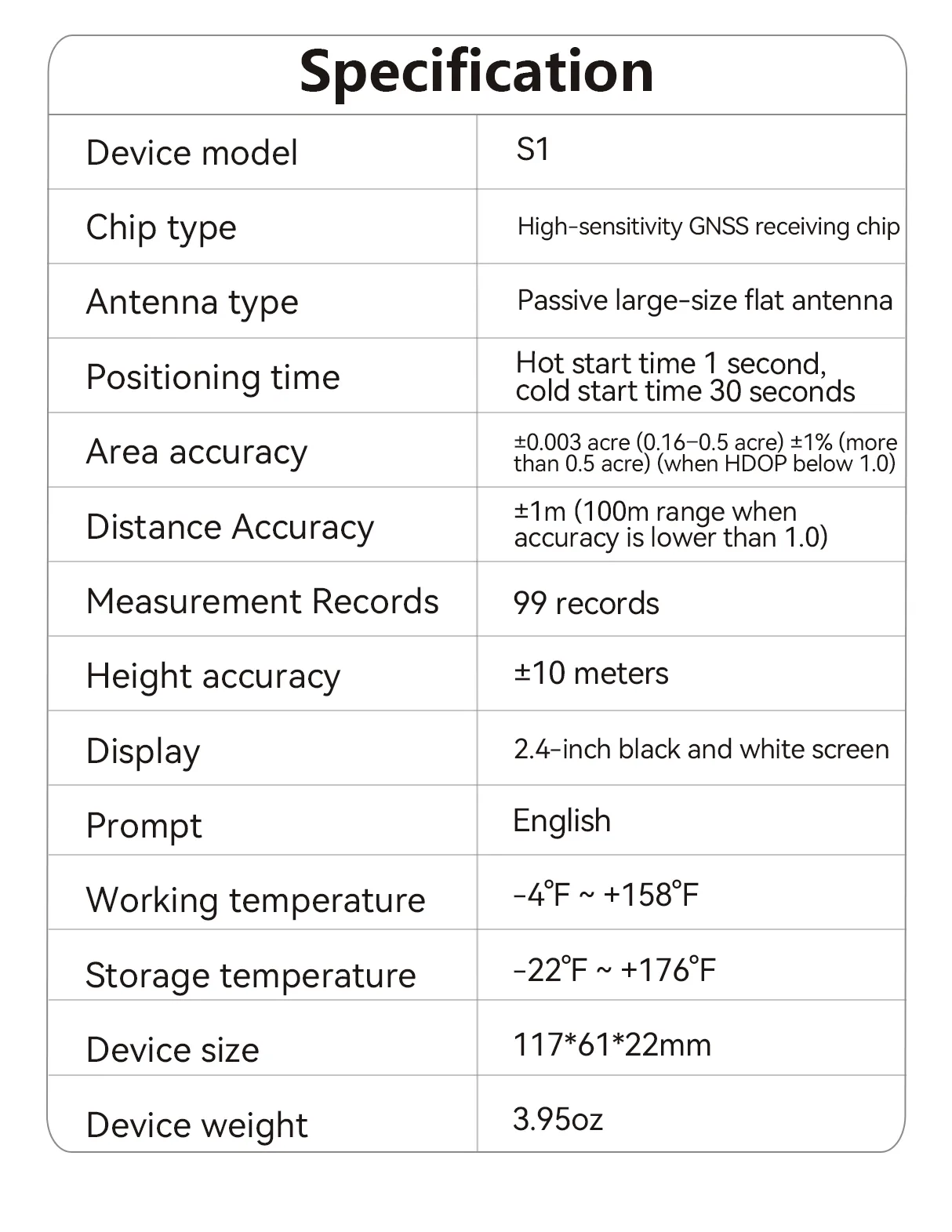 The S1 provides highly accurate measurements by utilizing four satellite systems (GPS, GLONASS, SBAS, BeiDou) simultaneously. Typical accuracy is within centimeters under optimal conditions.