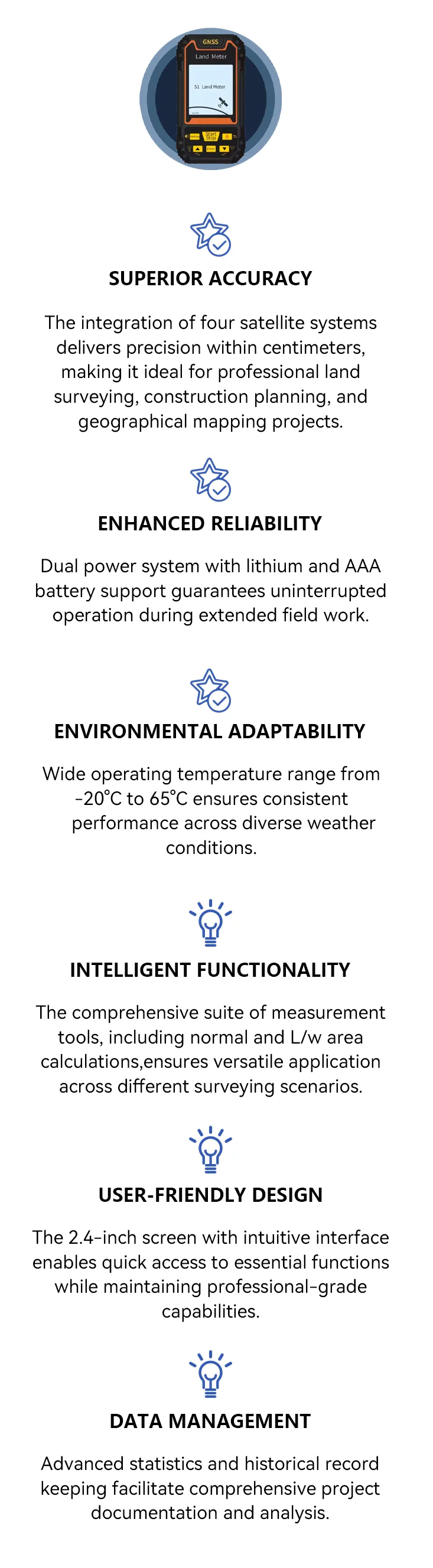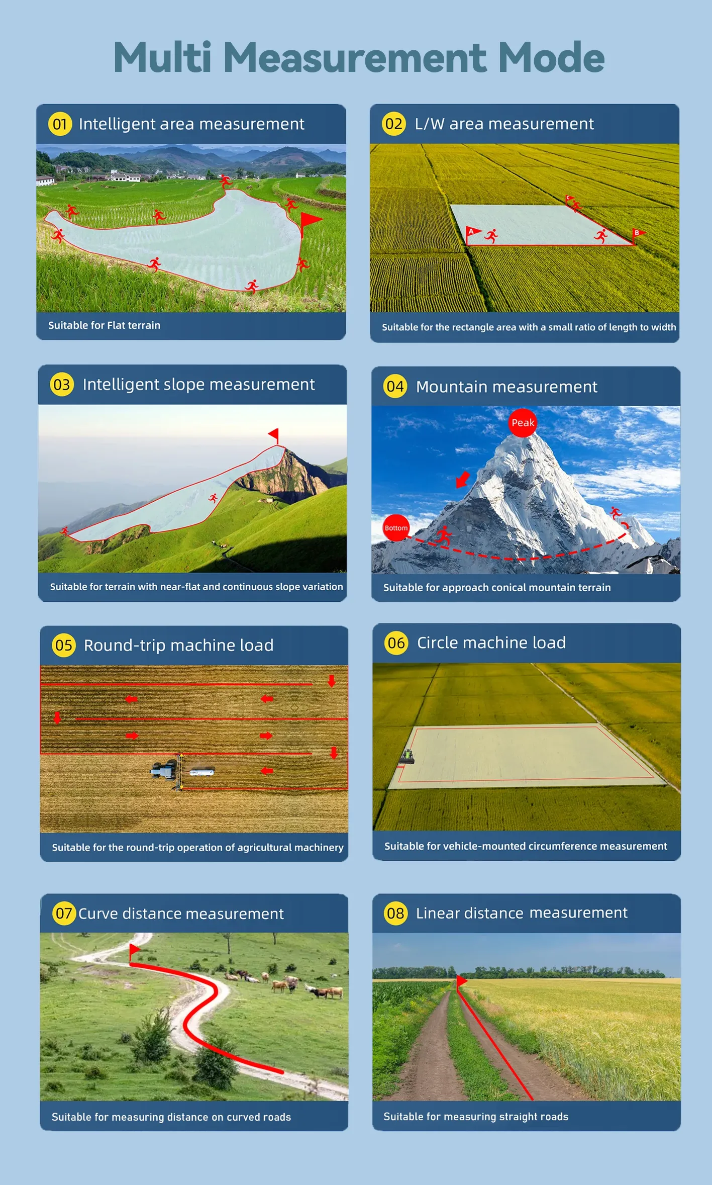 The Fynal Handheld GPS Land Meter offers precise Area and Distance measurements for a variety of applications. Whether you're working in farming, land contracting, precision agriculture, or insurance assessments, this device ensures accurate results for area calculations and distance tracking. Perfect for agricultural billing, tax inspections, and more.